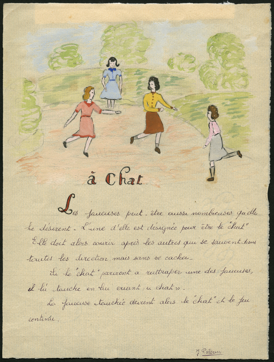 Le musée national de l'éducation conserve A chat, oeuvre de Pellerin Jeanine. Il s'agit d'une oeuvre en papier Canson (gouache). Mesures : hauteur 21 cm ; largeur 15,8 cm. Cette pièce a pour sujet : représentation humaine (jeu). Sa période de création est la 2e quart 20e siècle. À propos de cette pièce : enfant.