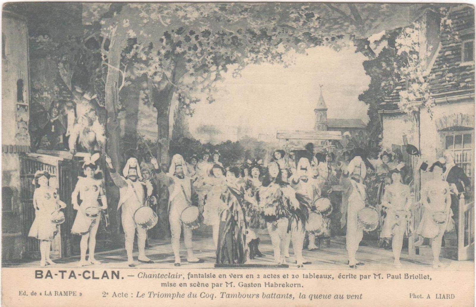 BA-TA-CLAN - Chantecler, fantaisie en vers en 2 actes et 20 tableaux écrite par M. Paul Briollet, mise en scène par M. Gaston HABREKORN. 2e acte : Le Triomphe du Coq. Tambours battants, la queue au vent. de "La RAMPE " (Editeur);LIARD A. (photographe) figure dans les collections du musée Edmond Rostand. Cette oeuvre est réalisée en papier (imprimé). Format : H. 14 cm ; l. 8,7 cm. Sa période de création est la 1er quart 20e siècle.