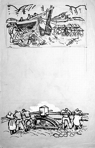 Cabestan et pêcheurs d'Yport : premières esquisses [titre attribué] est une pièce de dessin réalisée par Jean-Haffen Yvonne (1895-1993). Elle est réalisée avec la technique suivante : plume, pinceau, encre noire, gouache, mine de plomb, papier. Dimensions : H. 31, l. 20. Le motif représenté : scène (bord de mer, Manche, bateau, pêche aux engins, filet, réparation, marin pêcheur, objet, halage, abri, falaise, homme, femme, Yport). Cette réalisation date de la 3e quart 20e siècle. Précisions sur cette oeuvre : Paris, 1895 ; Dinan, 1993 ; femme#- salon de la Société nationale des Beaux-Arts (de 1928 à 1954 - elle en deviendra sociétaire en 1947)#- salon des Artistes décorateurs (de 1927 à 1935)#- Exposition coloniale (1931)#- Exposition internationale (1937)#- salon de la Marine (1948 et 1949)#- salon de l'Union des Femmes Peintres et Sculpteurs (1950, 1951, 1968 et 1969)#- Salon du dessin et de la peinture (de 1955 à 1980).