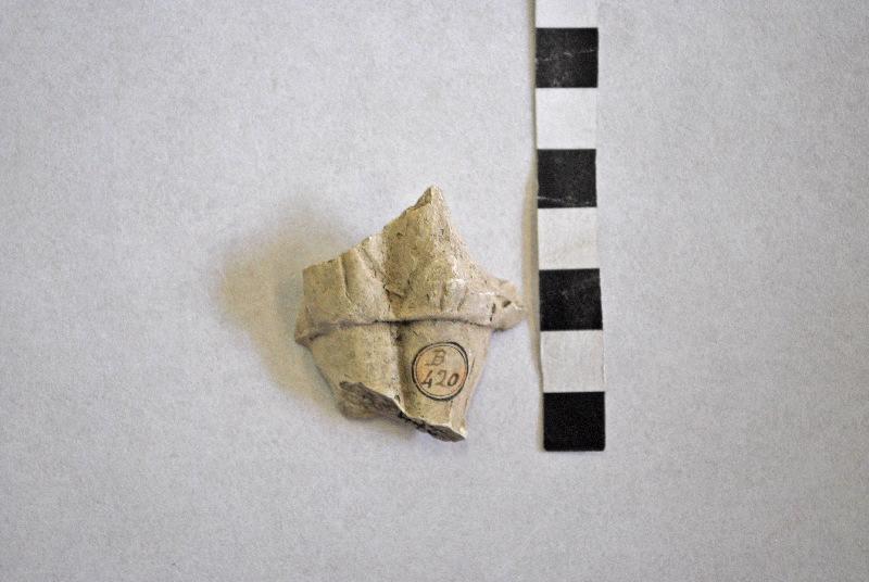 Fragment de Cucullatus en terre cuite blanche, bivalve : subsiste fragment antérieur des genoux