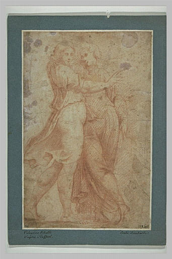 ATELIER DE RAPHAEL (d'après);anonyme a réalisé Deux figures debout, drapées, actuellement au musée du Louvre. Elle est réalisée avec la technique suivante : sanguine. Dimensions : H. en m 0,262 ; L. en m 0,172.
