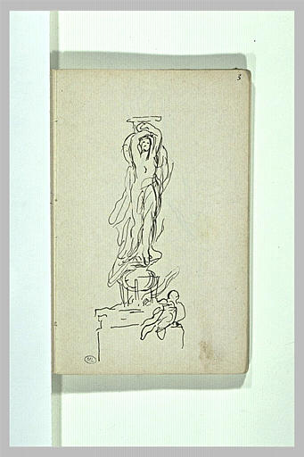 Album Chapu Henri -23-, folio 3, dessiné au recto ; Carnet de croquis relié de toile grise, taché d'encre sur les plats inférieurs et supérieurs, comprenant des études de sculpture, de monuments, de vases, ainsi que diverses notes manuscrites. H : 0,149 ; L : 0,095