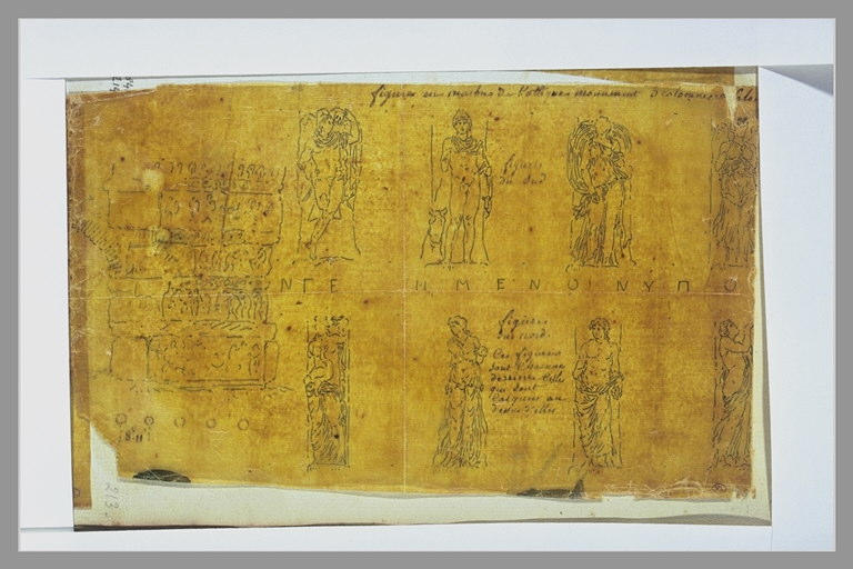 Album Cassas Louis-François -1-, folio 86, rapporté au recto ; Album relié en vert comprenant 298 dessins. On lit sur le dos du volume :Grèce, Dessins pour le voyage en Grèce du Cte de Choiseul. Mais une note collée au verso de la couverture, de la main de M. de Laborde dit que ces dessins n'ont pas servi à l'élaboration des planches du voyage en Grèce de Choiseul-Gouffier. Ce serait soit les dessins préparatoires de ce même ouvrage, soit les éléments d'un tout autre ouvrage. H. : 0,592 ; L. : 0,425. ; Annotation, à la plume et encre brune, en bas :figures en marbre de l'attique monument 5 colonnes à sa[...]. Dessin déchiré
