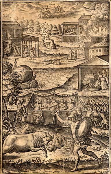 scène mythologique (Jason, combat, taureau, Médée, toison d'or, bouclier, casque),scène mythologique (Aeson, Médée, métamorphose, jeunesse),scène mythologique (Pélias, Médée, trahison, mort),scène mythologique (Médée, Jason, enfant, palais, flamme),scène mythologique (Médée, fuite, char myth, dragon),scène mythologique (Céphale, Procris, mort, jalousie)