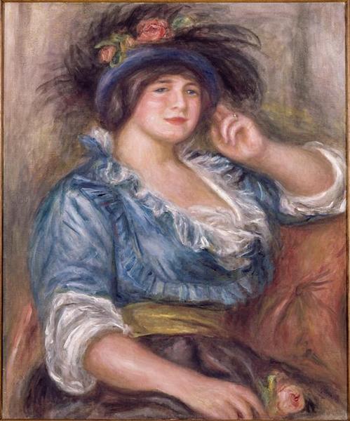 Jeune femme à la rose. Femme en bleu, oeuvre de peinture, spectacle - fête, est due à RENOIR Pierre Auguste et conservée au musée d'Orsay. Le procédé technique employé est peinture à l'huile, toile. Mesures : 65.5 H ; 54.5 L. On y reconnaît : portrait (Colonna Romano Gabrielle, Dreyfus Gabrielle, femme, assis, à mi-corps, de trois-quarts, accoudé, chapeau, rose, comédien). Elle a été créée durant la 1er quart 20e siècle. Note sur cette oeuvre : Limoges, 1841 ; Cagnes-sur-Mer, 1919.
