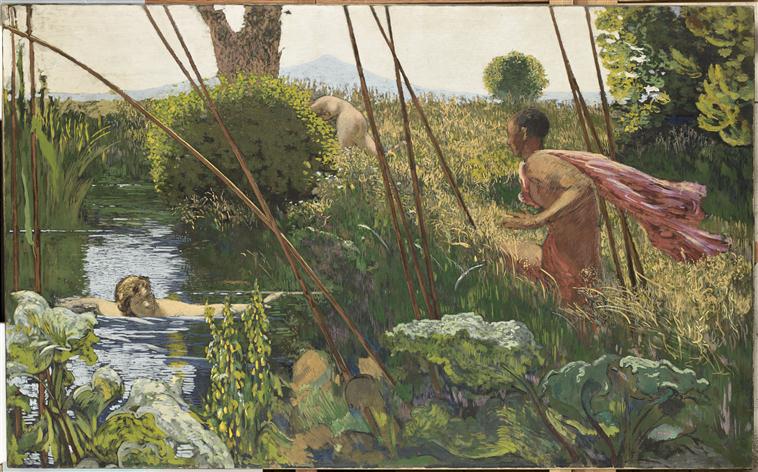 paysage (jeune homme, jeune fille, nu, baignade, rivière, végétation, ciel)