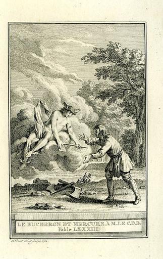 On doit Le bûcheron et Mercure, V, 1 (A M. Le C.D.B) à Oudry Jean-Baptiste (1686-1755) (d'après);PUNT Jan (graveur);NOMSZ J (éditeur);ALLART ET HOLTROP (imprimeur) ; l'oeuvre est au musée Jean de la Fontaine. Elle est réalisée avec la technique suivante : papier, gravé. Dimensions de l'oeuvre : Hauteur hors cadre en cm 13 ; Largeur hors cadre en cm 8 ; Feuille en cm 20 x 13. Elle figure : scène (Mercure, bûcheron, homme, hache),fond de paysage. L'oeuvre appartient à la 3e quart 18e siècle. Note sur cette oeuvre : OUDRY : Paris, 1686 ; Beauvais, 1755.
