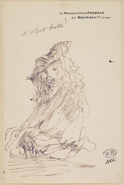 Le chat botté, portrait d'homme d'après la gravure de Rembrandt : Rembrandt appuyé (Bartsch 21) de Rodin Auguste (1840-1917);Rembrandt (1606-1669) (d'après) figure dans les collections du musée Rodin. Rodin Auguste (1840-1917);Rembrandt (1606-1669) (d'après) a utilisé ici plume, encre violette, papier (crème). Elle mesure 17.6 H ; 11.6 L. On y reconnaît : portrait (homme, tête, de profil). L'oeuvre date de la 1er quart 20e siècle. On sait de cette oeuvre que : Rodin : Paris, 1840 ; Meudon, 1917.