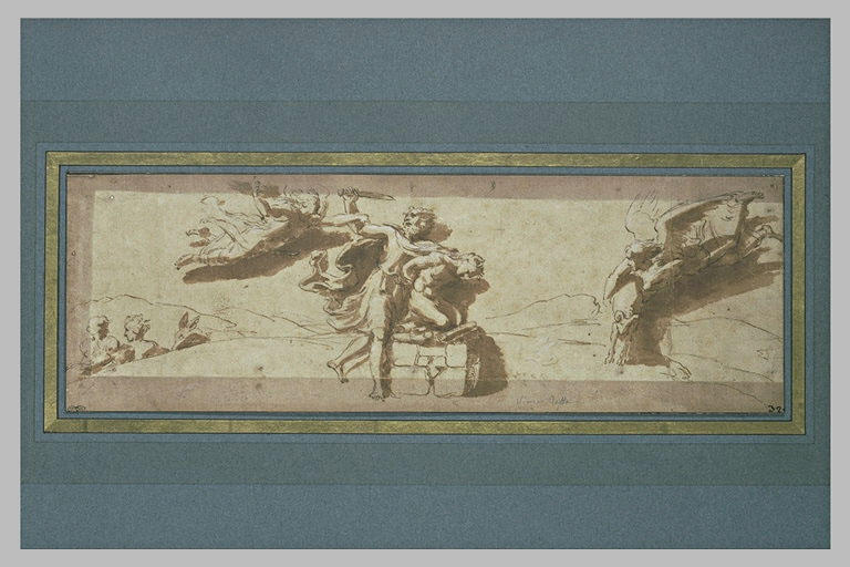 ATELIER DE RAPHAEL (d'après);anonyme est l'auteur de Le sacrifice d'Abraham, oeuvre conservée au musée du Louvre. Elle est réalisée avec la technique suivante : plume, encre brune, lavis brun, pierre noire, blanc (rehaut), collé en plein. Format : H. en m 0,140 ; L. en m 0,420.