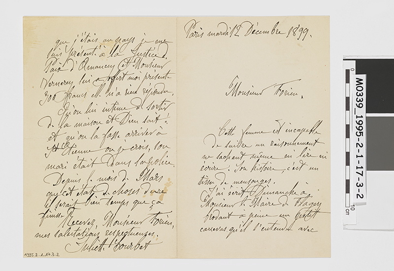 « Lettre de Juliette Courbet à Monsieur Forien (titre factice) » est conservée au musée Gustave Courbet, un établissement portant le label « Musée de France ». Ce label garantit que les collections font l'objet d'une gestion rigoureuse en matière de conservation, d'inventaire et d'accessibilité au public.