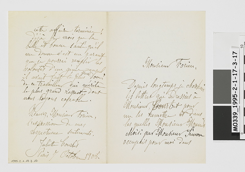« Lettre de Juliette Courbet à Monsieur Forien (titre factice) » est conservée au musée Gustave Courbet, un établissement portant le label « Musée de France ». Ce label garantit que les collections font l'objet d'une gestion rigoureuse en matière de conservation, d'inventaire et d'accessibilité au public.