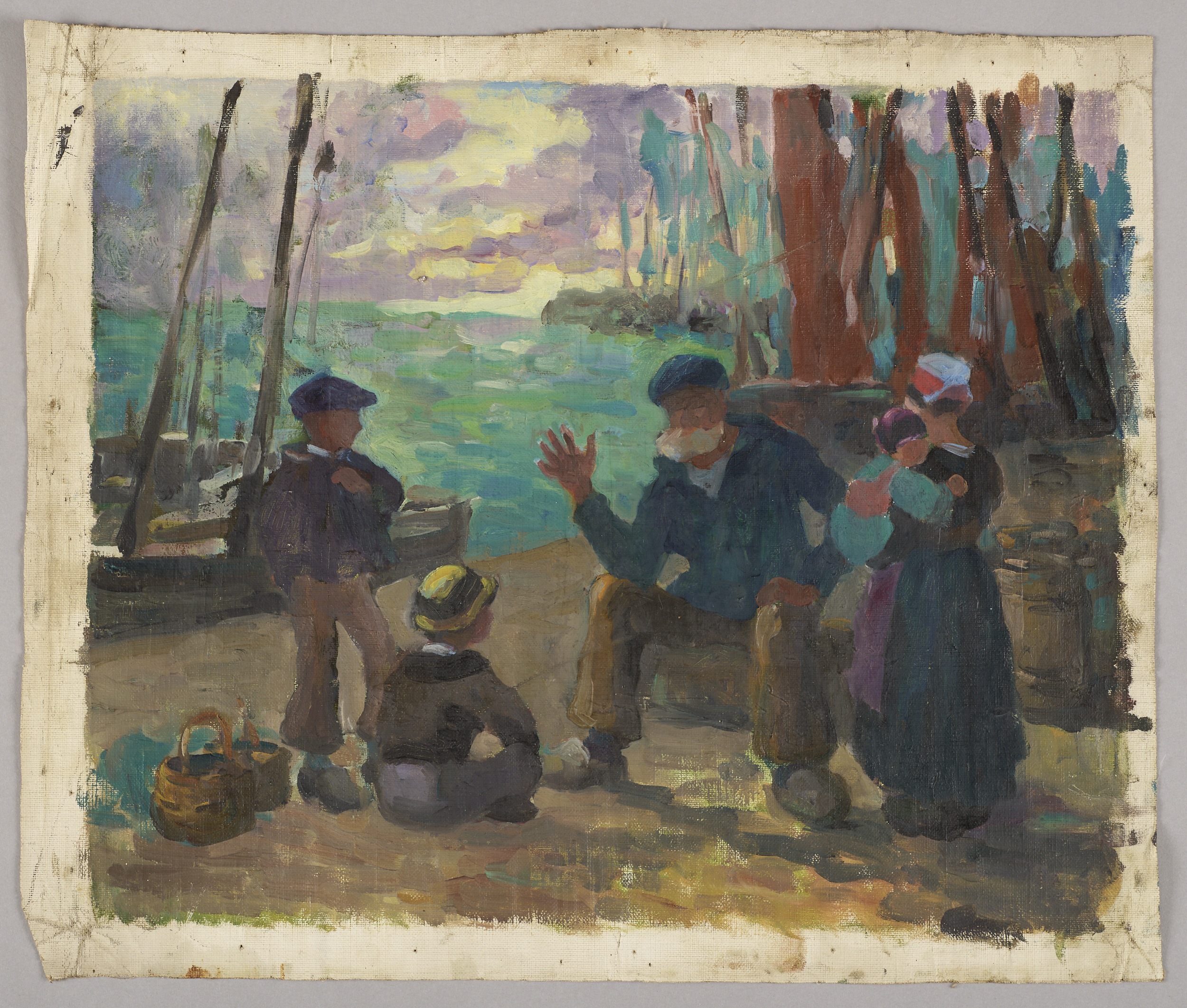 L'oeuvre intitulée Marin racontant une histoire est attribuée à Barbey Jeanne-Marie (1876-1960) et se trouve au musée des beaux-arts. Le procédé technique employé est huile, toile. La pièce a pour dimensions H.37.2 cm, l.44 cm. Elle figure : Scène de genre,marin,vieil,enfant,bébé,costume traditionnel breton,robe,coiffe,tablier,sabot,port,homme. L'oeuvre appartient à la 1ère moitié 20e siècle. Concernant cette pièce : Paris, 17/07/1876 ; Bagnolet, 12/08/1960.