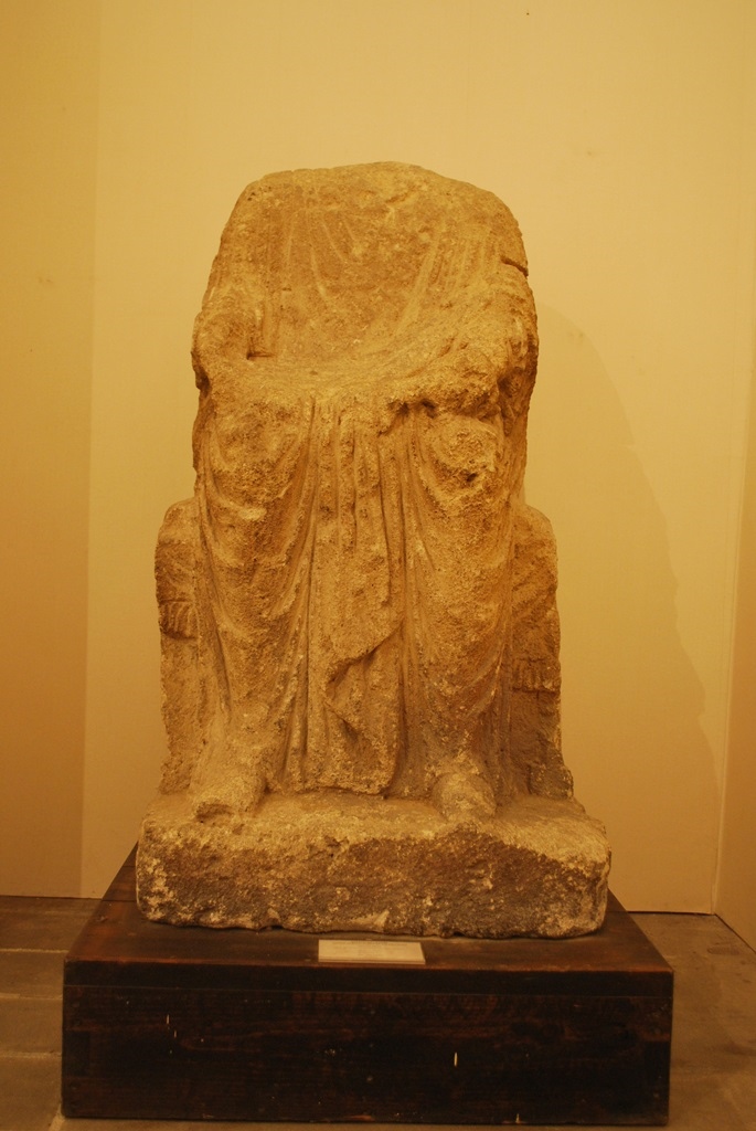 Sculpture en calcaire tendre local provenant du domaine du Clos, occupé en partie par l'actuel jardin public d'APT. Cette sculpture se trouvait auparavant dans le hall de l'Hôtel de Ville. Statue grandeur nature (1,18 m, sans la tête), représentant une déesse-mère, une MATER, assise sur un coussin disposé sur un tabouret à quatre pieds simples, reliés par des traverses delphiniformes et recouvert d'un lourd tissu frangé (hauteur du siège : 45 cm). Les bras reposent sur les cuisses dans une attitude hiératique. Elle est vêtue d'une tunique à manches mi-longues plissées qui recouvre les pieds habillés de chaussures fermées. Un manteau ample, drapé, découvre l'épaule et le bras droit et s'enroule autour du bras gauche ; un pan retombe en plis entre les jambes. Des encoches indiquent la position d'attributs disparus anciennement : la main droite tenait une patère en signe d'offrande et la main gauche repliée (dont l'annulaire est orné d'une bague) semble tenir et relever un pan du manteau tandis que dans le creux du bras reposait vraisemblablement une corne d'abondance. Sur les genoux, dans le creux du manteau, étaient déposés soit des fruits, soit une corbeille remplie de fruits (encoches). L'arrière de la statue (plis du costume et siège), grossièrement travaillé, n'était pas destiné à être vu.