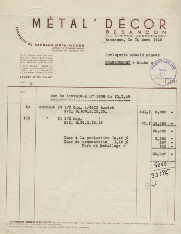 Facture adressée à la fabrique d'horlogerie Monnin Ernest à Charquemont (Doubs).