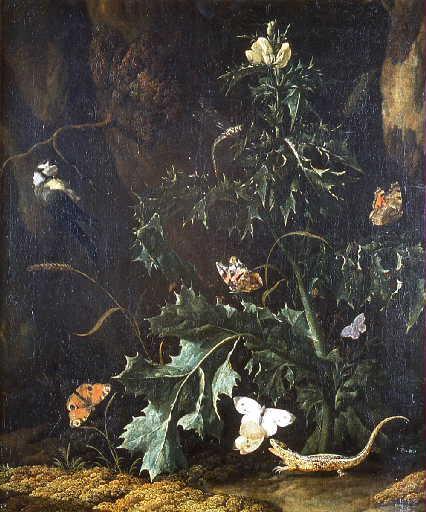 Papillons, lézard, oiseau et libellule (autour d'un chardon) (VAN SCHRIECK Otto Marseus) est une oeuvre des collections du musée Rolin relevant de peinture. Elle est réalisée avec la technique suivante : peinture à l'huile, toile. Cette pièce mesure Hauteur en cm 59.7 ; Largeur en cm 51 ; Hauteur avec cadre en cm 83.5 ; Largeur avec cadre en cm 74.5 ; Epaisseur totale en cm 6.5. L'oeuvre représente : allégorie,représentation animalière,représentation végétale (papillon, lézard, oiseau, libellule, chardon). La création de cette oeuvre remonte à la 17e siècle. Précisions sur cette oeuvre : VAN SCHRIECK : Nimègue, 1619 ; Amsterdam, 1678.