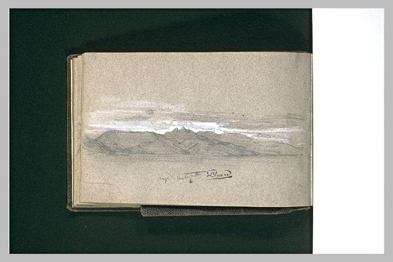 Album Belly Léon Adolphe -2-, folio 14, dessiné au verso ; Album cartonné, recouvert de papier grenu brun, comprenant 57 feuillets de papier blanc et gris, illustré de croquis à la plume et encre brune, au crayon noir, à la mine de plomb et à l'aquarelle, rehaussés parfois de sanguine, de gouache blanche ou de crayons de couleurs, souvent localisés et datés, accompagnés de notes manuscrites au début et à la fin de l'album. Trace de folio coupé entre les folios 29 et 30. H. 0,142 ; L. 0,219