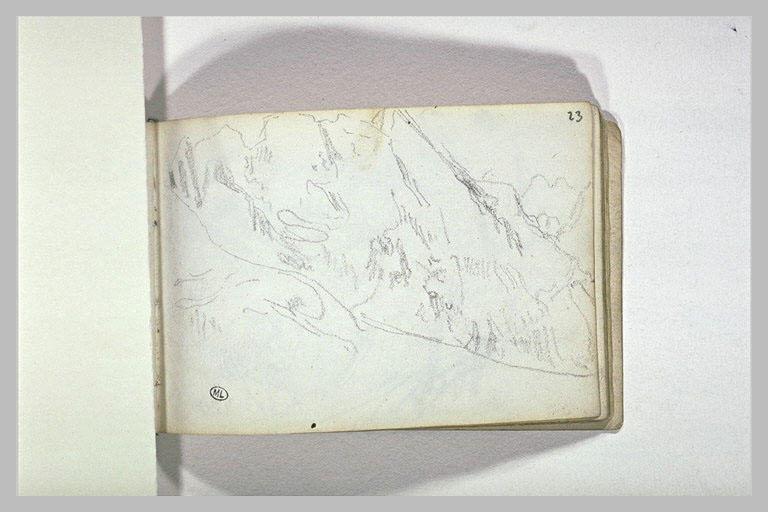 Album Andrieu Pierre -4-, folio 23, dessiné au recto ; Carnet cartonné, anciennement classé à Delacroix, comportant le cachet E. D. sur plusieurs folios. Croquis d'animaux, de paysages de montagne et de personnages. H. 0,091 ; L. 0,137
