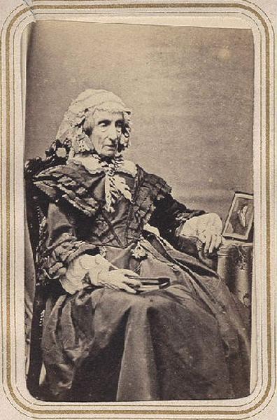 Photographie de la reine Marie-Amélie (1782-1866), âgée, assise, tenant un livre de la main droite, et la main gauche posée sur un guéridon portant la gravure de Louis-Philippe en civil (modèle du tableau de Jalabert)