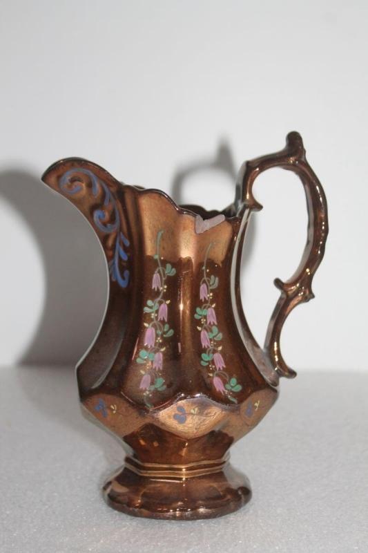 Pichet à eau recouvert d'un lustre or et décoré de fleurs. Ce pichet est formé de huit plis reliés à la panse par des facettes, raccordées à un piédouche.