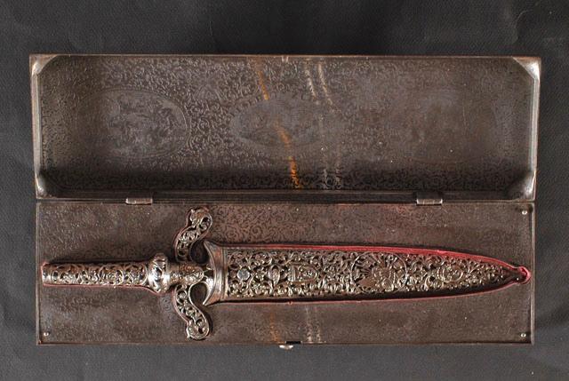 Poignard en argent dans sa boîte en argent est une oeuvre de ZULOAGA Eusebio, conservée au musée Condé. Cette pièce est en argent. Dimensions : Hauteur en cm 5 ; Longueur en cm 35.8. On y reconnaît : ornementation (ornement à forme végétale, rinceau). Sa période de création est la 2e quart 19e siècle. On sait de cette oeuvre que : ZULOAGA : Madrid, 1808 ; Bilbao, 1898 ; nationalité : Espagnole.