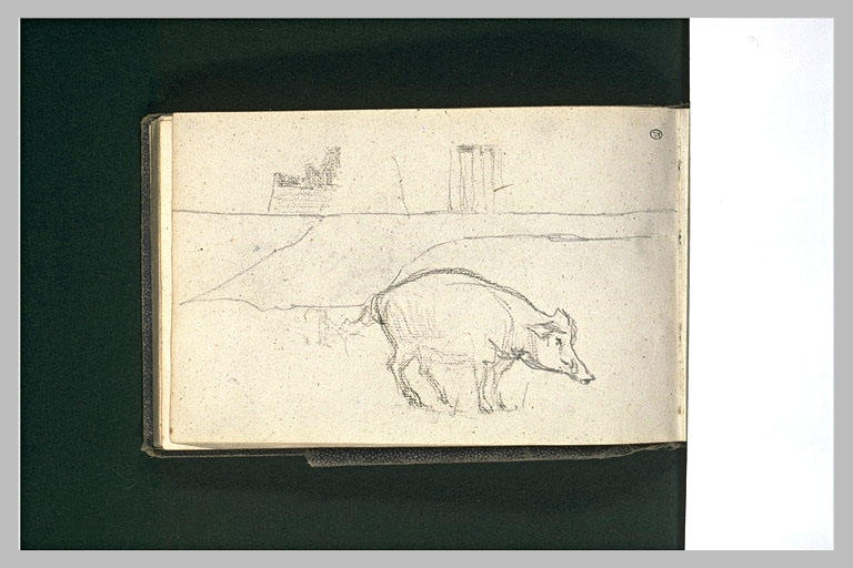 Album Belly Léon Adolphe -2-, folio 54, dessiné au verso ; Album cartonné, recouvert de papier grenu brun, comprenant 57 feuillets de papier blanc et gris, illustré de croquis à la plume et encre brune, au crayon noir, à la mine de plomb et à l'aquarelle, rehaussés parfois de sanguine, de gouache blanche ou de crayons de couleurs, souvent localisés et datés, accompagnés de notes manuscrites au début et à la fin de l'album. Trace de folio coupé entre les folios 29 et 30. H. 0,142 ; L. 0,219