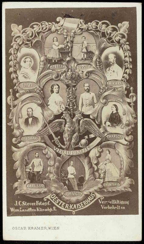 portrait collectif (empereur d'Autriche, famille, Bavière Sophie Charlotte de, Habsbourg-Lorraine François Joseph Ier de, Elisabeth d'Autriche, impératrice d'Autriche, Habsbourg-Lorraine Rodolphe de, Habsbourg-Lorraine Gisèle de, Autriche Franz Karl d', Habsbourg Maximilien de : empereur du Mexique, Charlotte de Belgique, Saxe duchesse de, Autriche Louis Victor d', Autriche Charles Louis d', Bourbon-Siciles Marie-Annonciade de)