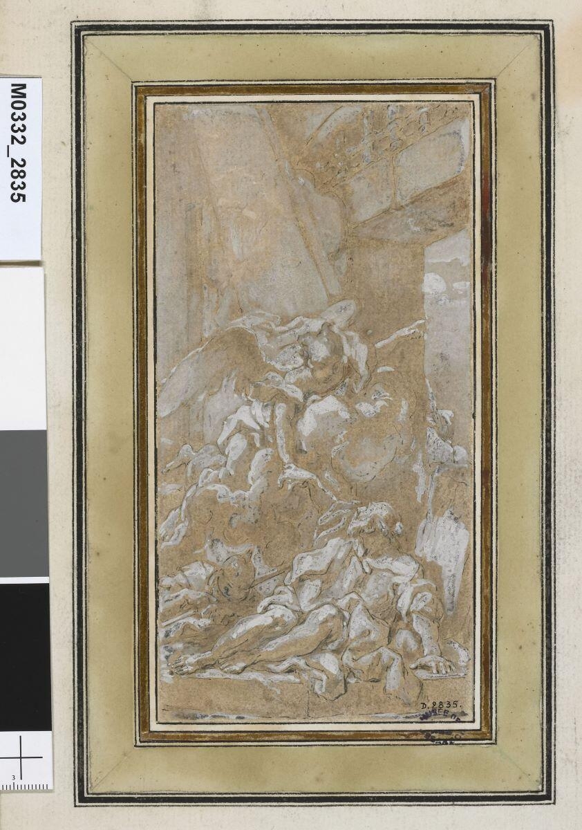 Cette œuvre relève du domaine : dessin. Elle a été réalisée avec les matériaux et techniques suivants : papier (crème) (plume, encre, lavis brun, gouache(rehaut), collé en plein). Sa période de création est identifiée comme : 18e siècle.