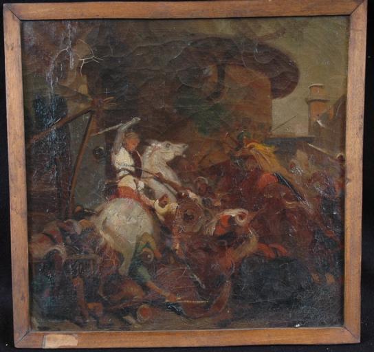 Scène de combat entre des Croisés et des Turcs ? est une oeuvre de peinture par GIRARDET Karl (attribué à), visible au musée d'art et d'archéologie. Il s'agit d'une oeuvre en peinture à l'huile, toile. Format : H. 0,368 ; l. 0,383 m. Cette pièce a pour sujet : scène historique (combat singulier, Châtillon Gaucher de, Minieh, croisade). Elle a été créée durant la 2e quart 19e siècle. Détail à relever : Locle, 1813 ; Paris, 1871.