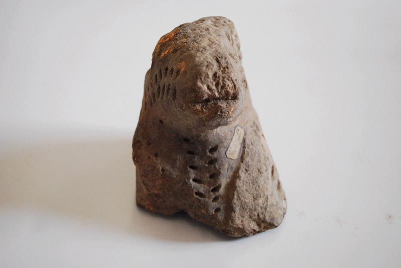 Chenet à tête de bélier, en terre cuite orangée, à base triangulaire; un rouleau de corne subsiste; les yeux marqués par une protubérance sphérique; le mufle conique tronqué est incisé profondément pour figurer la bouche; orné d'une double ligne de petites obliques incisées partant de chaque côté du mufle (joues, dessous de rouleaux) et se prolongeant vers la nuque, une 3° longeant la gorge, une 4° sur le côté gauche du cou (symétrie à droite ne subsiste pas ?); sur la nuque même motif repris sur une protubérance à section triangulaire, à la fois encadrant et repris sur le rehaut. La partie droite-arrière (rouleau, oeil) est très endommagée