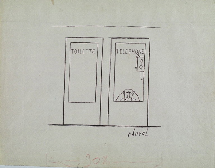 Toilette-téléphone est une oeuvre de dessin par Chaval Yvan LE LOUARN Dit (10 /02 /1915 - 22 /01 /1968), visible au musée des beaux-arts. papier (encre de chine) est le procédé utilisé pour cette oeuvre. Format : Hauteur de la feuille en mm 240 ; Largeur de la feuille en mm 315. L'oeuvre représente : (téléphonie)#(cabinet de toilette)#scènes (scènes)#(homme). La création de cette oeuvre remonte à la 20e siècle. On sait de cette oeuvre que : Chaval Yvan LE LOUARN Dit : Bordeaux, 10/02/1915 ; Paris, 22/01/1968.