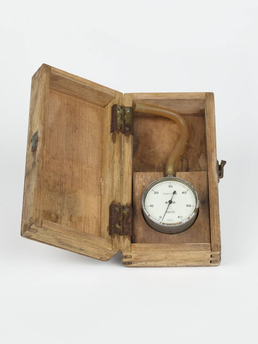 Manomètre de marque Aneto composé d'un cadran gradué et d'un tube en caoutchouc. Il se range dans un coffret en bois.