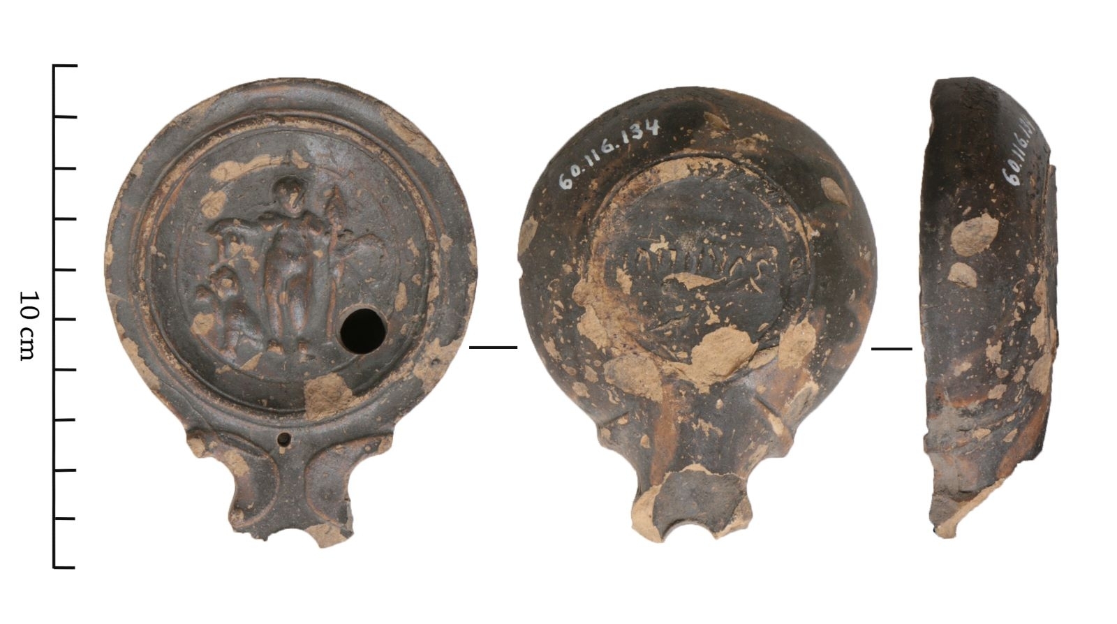 L'oeuvre a été exécutée en terre cuite (moulé, engobe, cuisson). L'oeuvre présente les dimensions suivantes : L. 9.1 cm ; H. 2.3 cm ; D. 7.1 cm ; Vol. 0,0001. Le sujet de cette oeuvre : divinité (Bacchus). Elle a été créée durant la 1er siècle;2e siècle. On sait de cette oeuvre que : Bonnet Jacqueline, Delplace Christiane dans Lampes signées de Gaule : "Des moules auraient été signalés à Vichy = Information orale J. Corrocher; Leibundgut, p. 68, n. 5 {CIL XIII, 10 001, 311 a); « Firmalamp » de Vichy ; trois « Firmalampen » du musée de Clermont, inv. 56 465-73, 6 758, 56 174-31 = Brentchaloff, n. 233-235; trois lampes à volutes à bec triangulaire (Ponsich II A) du musée de Clermont, inv. 60 116- 134, 56 465 - 109, 56 465 - 85 = Brentchaloff, n. 38, « Bacchus de face, déversant un cratère dans la gueule d'une panthère, la main gauche tient le thyrse auquel est accrochée une bandelette » ; n. 55 « Biche au repos, à gauche, tête tournée » ; n. 59 « Chien assis à gauche levant une patte » ; une lampe à volutes à bec triangulaire (Ponsich II Al) provenant de Lezoux, route de Maringues (dépotoir) = Vertet (H.) « Observations sur les vases à médaillons d'appliques de la vallée du Rhône», Gallia 27, 1969, p. 120 (cervidé à gauche devant un arbuste); une lampe à volutes à bec en ogive (Ponsich II Bl), même provenance, ibid. (taureau à gauche). Vertet, H., loc.cit., p. 120, compare iconographiquement ces deux derniers documents à des médaillons d'applique non signés. D'autre part, il cite (p. 97) un flanc de gourde signé SVRILLI. Ces éléments permettent de faire de SVRILLVS un potier, fabricant de lampes et de médaillons. (..) Leibundgut cite une quinzaine de lampes à Lezoux ; confirmation chez Vaginay, M., «Lampes gallo-romaines en terre cuite trouvées à Roanne», Bull, de la Diana 46, 2, 1979, p. 42-43, qui cite également la présence de moules.".