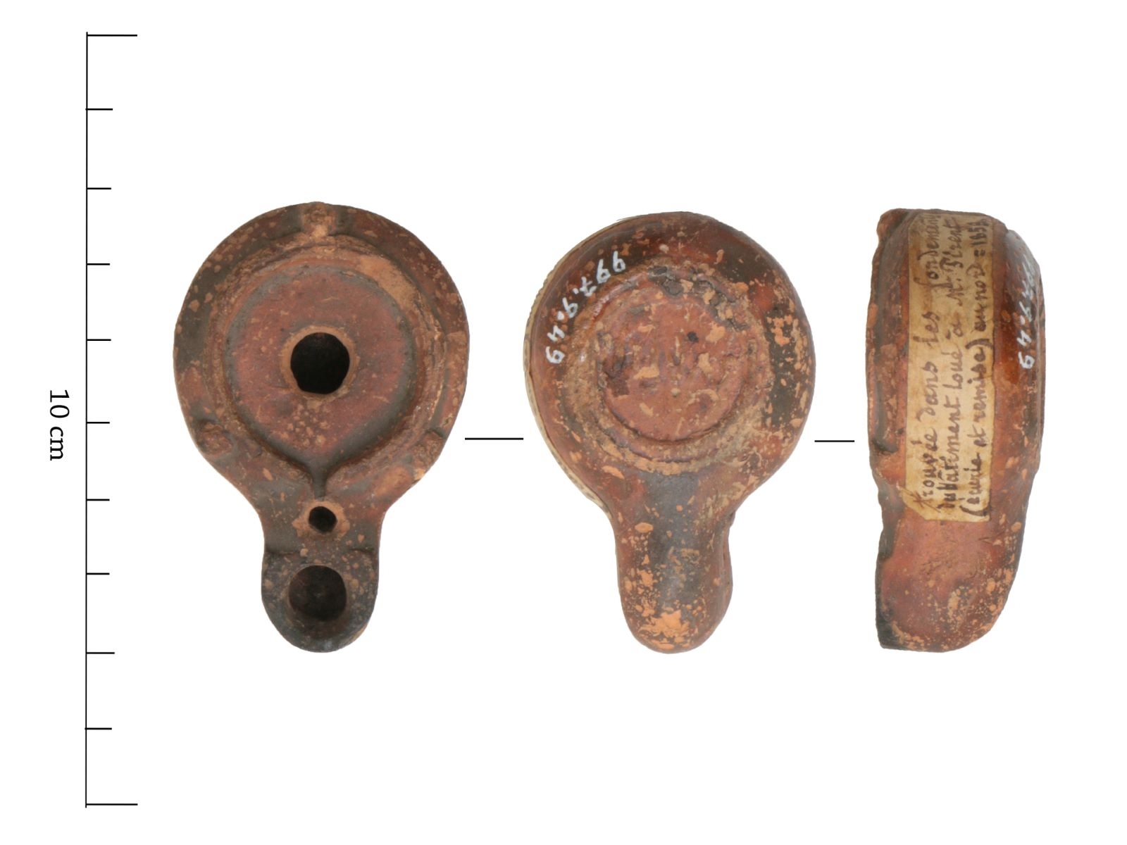 Loeschcke IX c. Petite firmalampen (veilleuse) moulée sans anse. Réservoir circulaire de profil biconvexe. Bandeau penché vers l'extérieur portant trois tenons rectangulaires non percés, sur l'axe horizontal. Disque en cuvette bordée par un bourrelet. Ce bourrelet est interrompu par un canal en V dans l'axe longitudinal du dessus du bec biseauté. Ce canal ne communique pas avec le trou de mèche qui est sur un plan plus élevé. Trou d'évent. Base circulaire plate limitée par deux anneaux concentriques enfermant la marque en relief "SVRILLI". Traces d'utilisation.