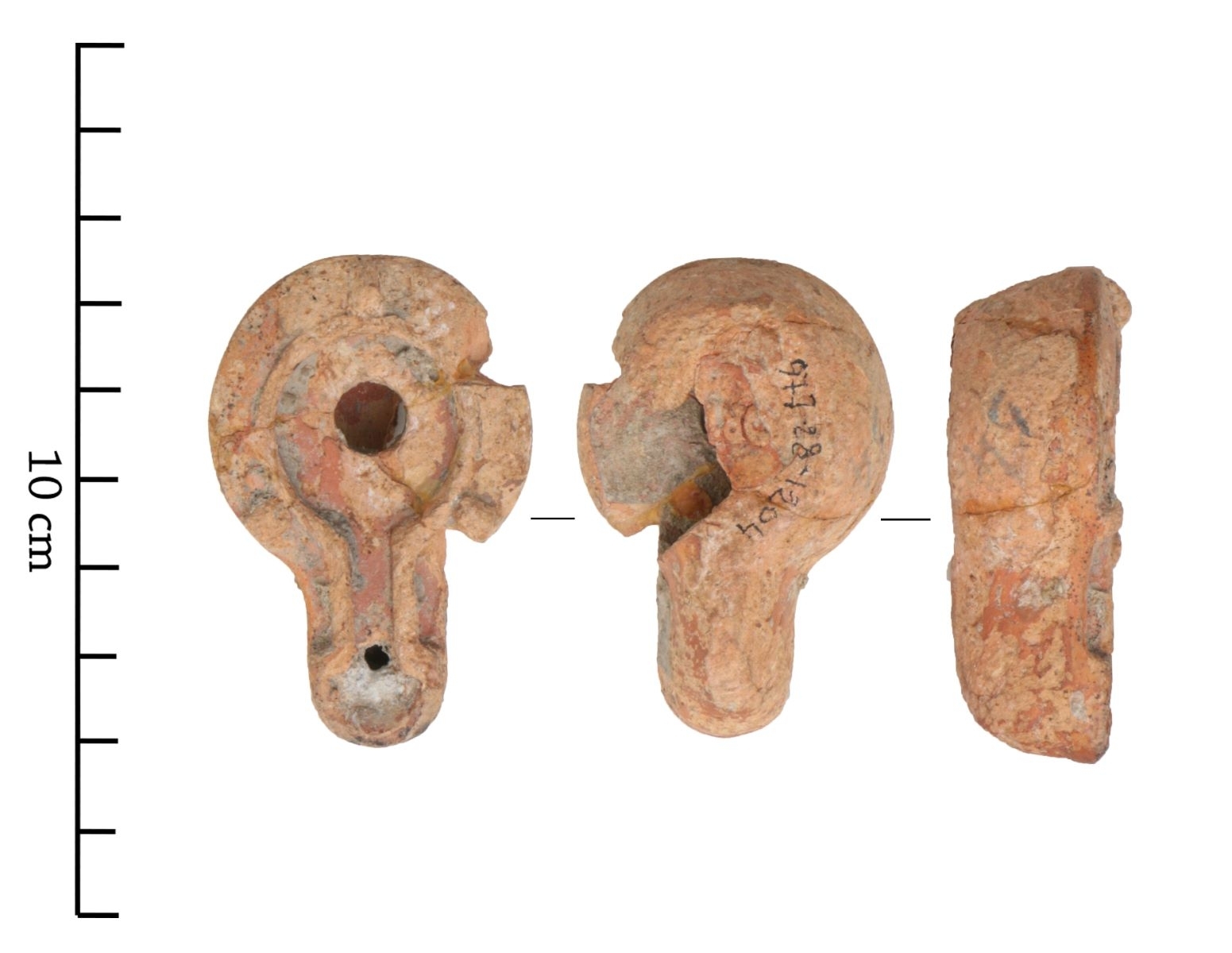 Loeschcke X a. Firmalampen moulée sans anse. Réservoir circulaire de profil biconvexe. Bandeau penché vers l'extérieur portant trois tenons rectangulaires non percés, sur l'axe horizontal. Disque en cuvette bordée par un bourrelet. Trou de remplissage central. Bec long au méplat en forme de pelle et ouvert sur le disque. Base circulaire plate limitée par un bourrelet enfermant la marque "...ORT..." en relief. Traces d'utilisation.