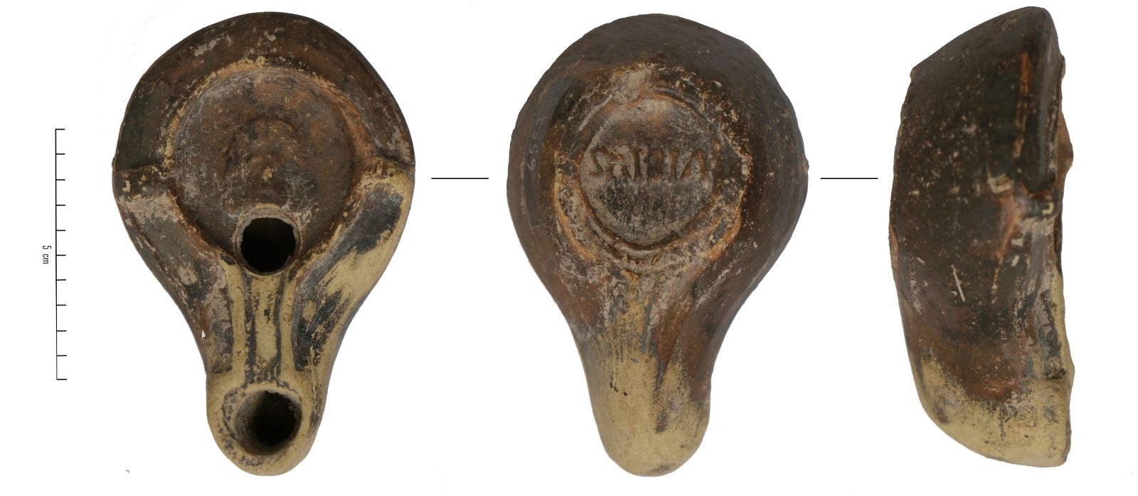 Loeschcke X a. Firmalampen moulée, sans anse. Réservoir circulaire de profil biconvexe. Bandeau penché vers l'extérieur, porte deux tenons rectangulaires. Disque en cuvette bordée par un bourrelet ouvert sur le bec au méplat en forme de pelle. Base circulaire plate limitée par deux anneaux concentriques, porte la marque "VIBIVS" en relief. Décor flou dû à un surmoulage.