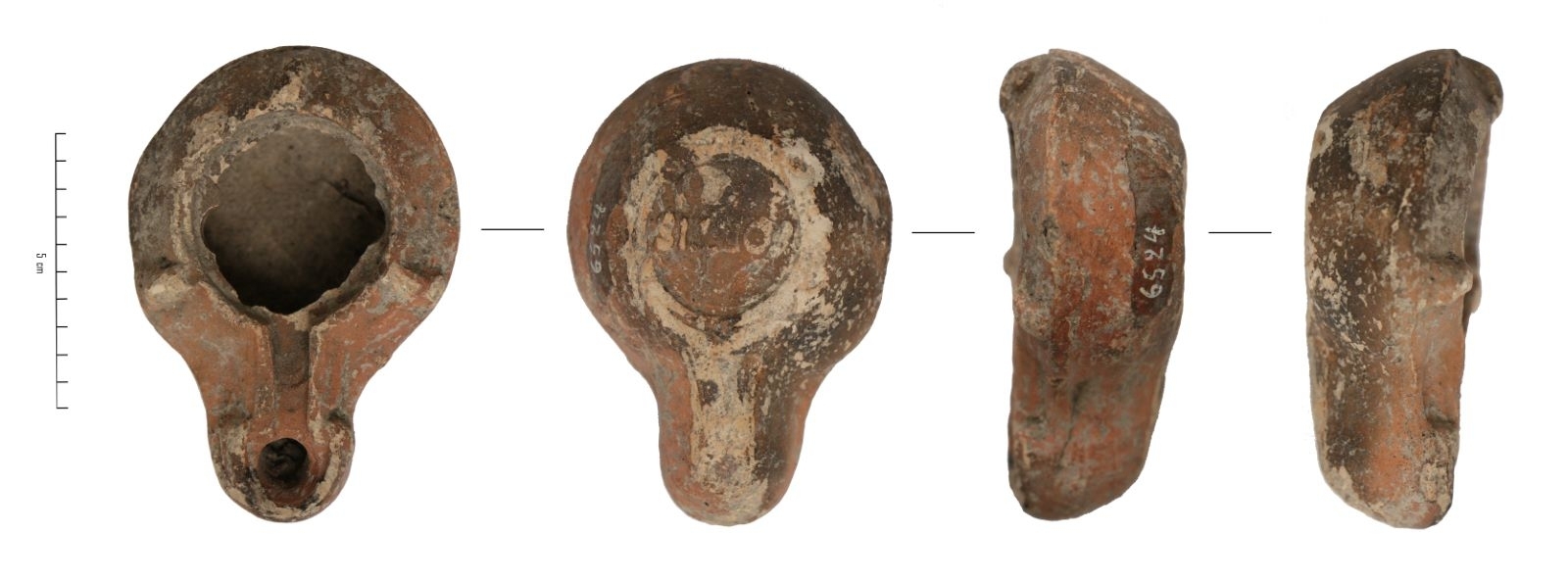 Loeschcke X a. Firmalampen moulée, sans anse. Réservoir circulaire de profil biconvexe. Bandeau penché vers l'extérieur portant trois tenons rectangulaires. Médaillon en cuvette bordée par un bourrelet interrompu au niveau du bec. Bec long au méplat en forme de pelle. Base circulaire plate limitée par deux anneaux concentriques porte la marque "FORTIS" en relief. Le médaillon manquant semble avoir été oblitéré volontairement. Traces d'utilisation.