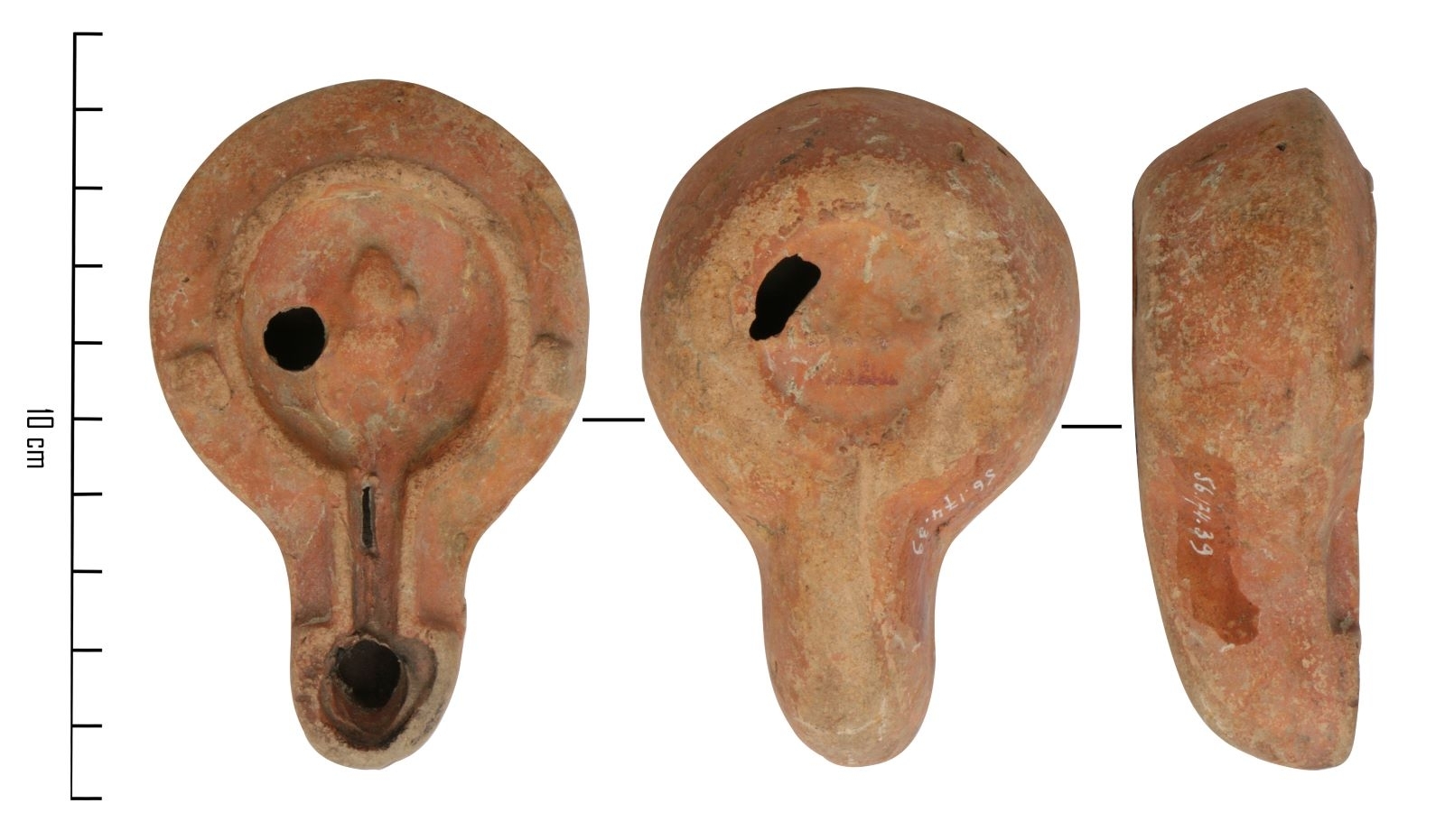 Loeschcke X a. Firmalampen moulée sans anse. Réservoir circulaire de profil biconvexe. Bandeau penché vers l'extérieur portant deux tenons rectangulaires non percés, sur l'axe horizontal. Disque en cuvette bordée par un bourrelet. Bec long au méplat en forme de pelle et ouvert sur le disque, porte un canal étroit. Base circulaire plate limitée par un bourrelet portant la marque "FORTIS" en relief. Incision longue servant de trou d'évent. Trou de remplissage sur la gauche du décor. Lampe surmoulée, au décor flou, avec des bulles de surmoulage. Traces d'utilisation.