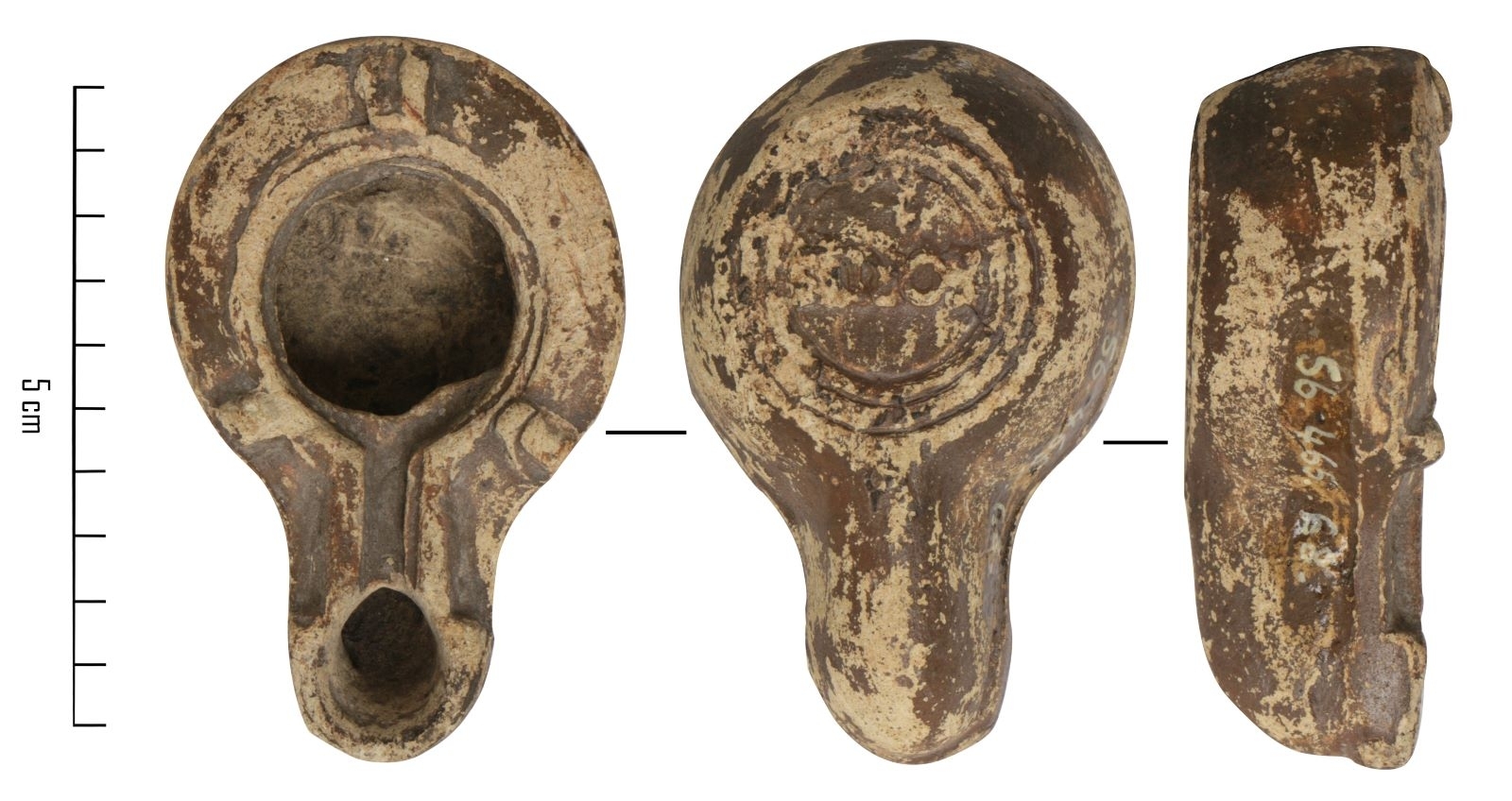 Loeschcke X a. Firmalampen moulée, sans anse, de petites dimensions (veilleuse). Réservoir circulaire de profil biconvexe. Bandeau penché vers l'extérieur portant trois tenons rectangulaires non percés. Médaillon en cuvette bordé par un bourrelet. Bec long ouvert sur le disque au méplat en forme de pelle, porte un canal étroit. Base circulaire plate limitée par deux anneaux concentriques portant la marque "FORTIS" en relief. Le médaillon vraisemblablement oblitéré volontairement.