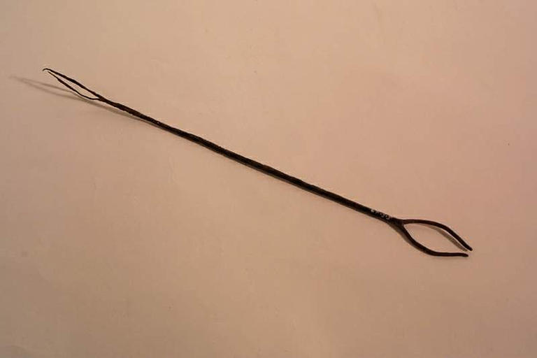 Tige de section circulaire, terminée à chaque extrémité par une fourche à deux dents dont une est abimée.