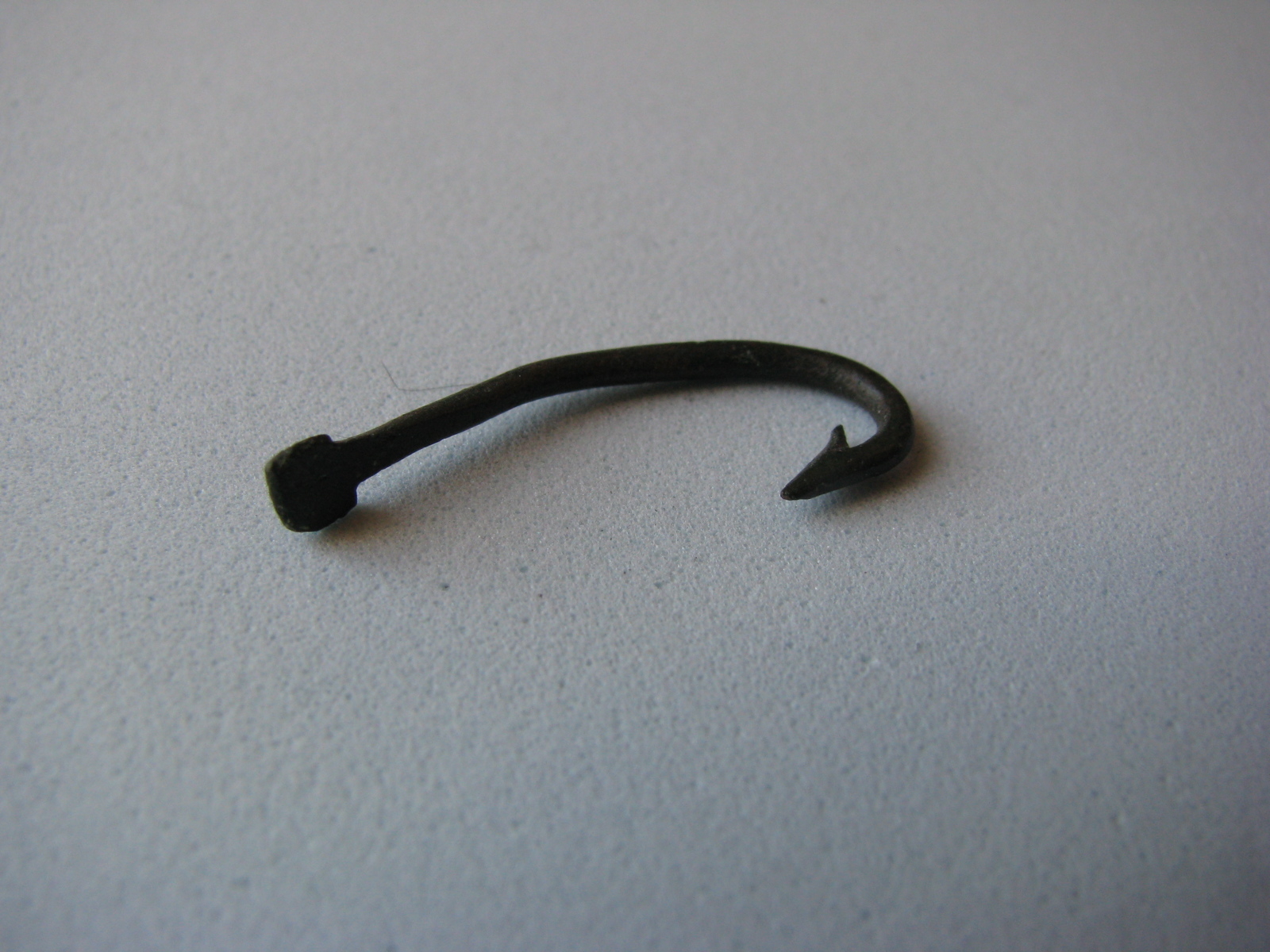 Hameçon composé d'une tige circulaire courbée avec un crochet. Petit tenon de préhension rectangulaire.