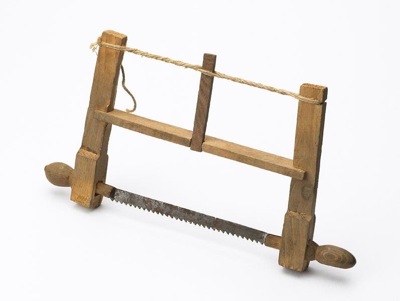 Cette pièce est en bois, ficelle, métal. Dimensions : L. 21.5 cm ; H. 11.5 cm ; E. 1.6 cm ; VOLUM. 0,0004 (scie). L'oeuvre appartient à la 1er quart 20e siècle.