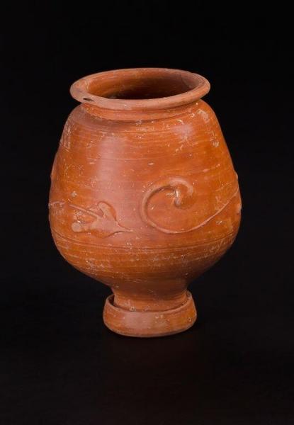 Il s'agit d'une oeuvre en céramique (sigillé). Mesures : H. 13 cm ; D. 10 cm ; VOLUM. 0,001 (Dimensions d'encombrement). Le sujet représenté est : ornement à forme végétale (rinceau). L'oeuvre appartient à la 4e siècle.