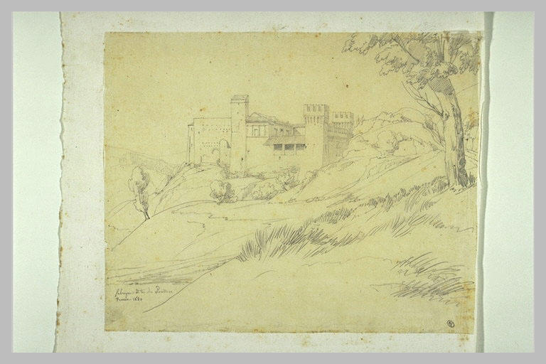 De Michallon Achille-Etna (1796-1822), Construction fortifiée dominant un paysage accidenté est conservée au musée du Louvre dans le domaine dessin. La technique employée est : mine de plomb, papier calque. Dimensions de l'oeuvre : H. en m 0,215 ; L. en m 0,266. Le thème de l'oeuvre est : paysage. Sa période de création est la 1er quart 19e siècle. On sait de cette oeuvre que : né en 1796 ; mort en 1822.
