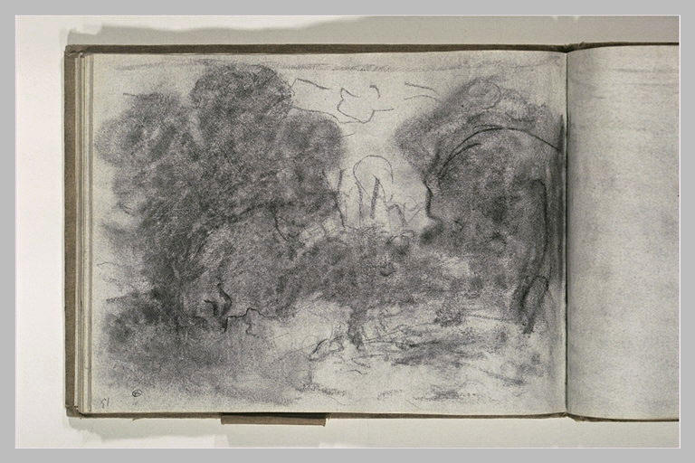 Album Bazille Frédéric -2-, folio 13, dessiné au recto ; Album cartonné recouvert de toile beige. Etudes de paysages, caricatures, études de nus et portraits. Traces de folios manquant entre les folios 1 et 2, 5 et 6, 11 et 12, 17 et 18, 20 et 21, 21 et 22, 26 et 27. H. 0,230 ; L. 0,305