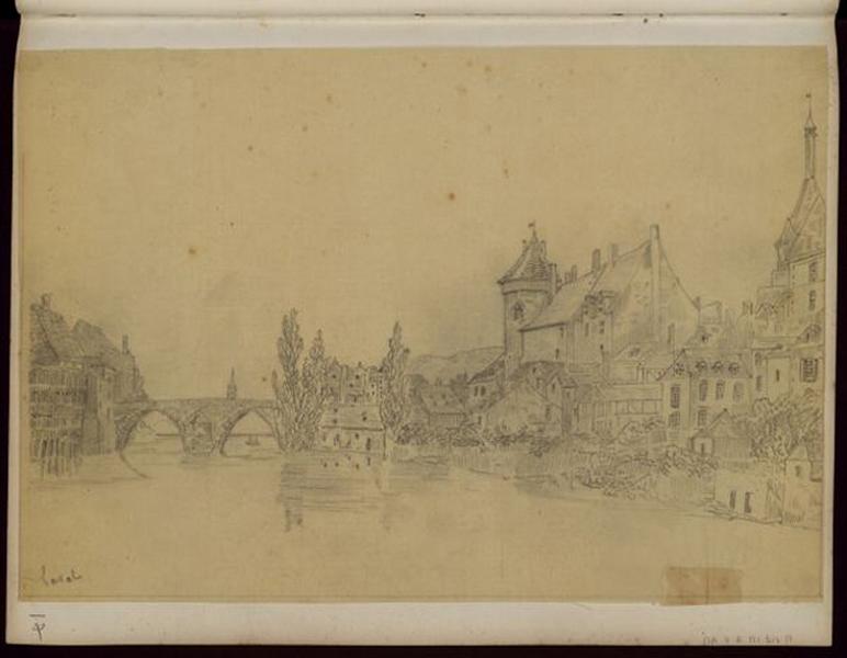 paysage (Laval, pont, château, maison, arbre, rivière)