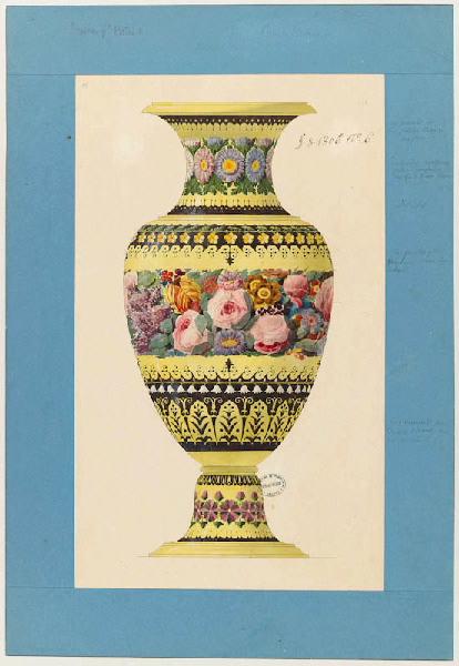 Vase Floréal de Brongniart Alexandre Théodore (1739-1813);manufacture de Sèvres figure dans les collections du musée national de la céramique. Le procédé technique employé est graphite, gouache, lavis, plume, encre, papier. Cette pièce mesure Hauteur 0.35 ; Largeur 0.21 ; Hauteur avec montage 69.9 ; Largeur avec montage 50. Sujet représenté : représentation d'objet (vase),ornementation (frise, ornement à forme végétale). L'oeuvre date de la 1er quart 19e siècle. Concernant cette pièce : BRONGNIART Alexandre Théodore dit BRONGNIART Père Paris, 1739 ; Paris, 1813 ; architecte, auteur de formes et décors à Sèvres de 1800 à 1813 ; manufacture de Sèvres : fondée en 1756.